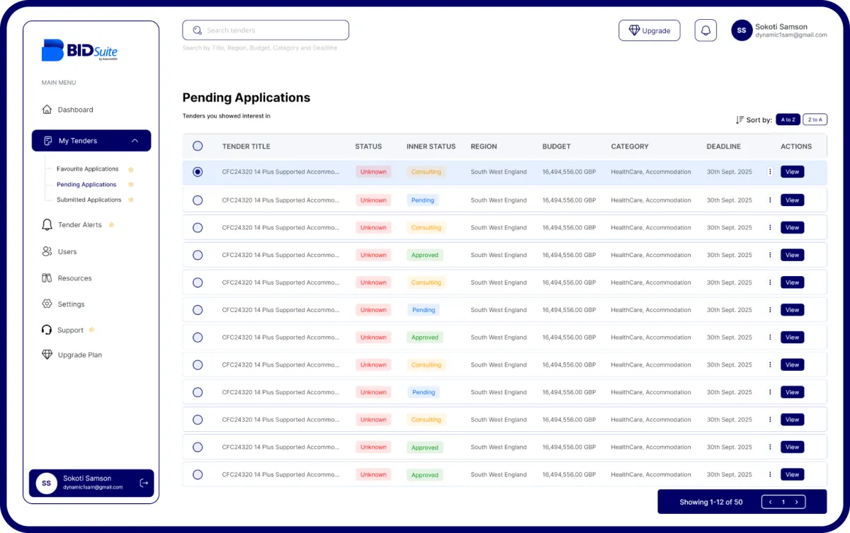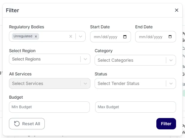 BIDSuite’s smart filters let you refine by category, region, and regulatory body — so you only see the opportunities that truly fit your services.